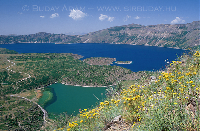 A Nemrut-hegy kalderájában található két tó vize eltérő hőmérsékletű, a kékebb a hideg, a zöldes a melegebb – ebben másféle algák élnek, főként ez okozza a színváltozást. Erre az útra a teljes fotósfelszerelésemet magammal vittem, ami nem csak a kisfilmes gépet, hanem a középformátumú Kiev 88-as gépet is jelentette. Így alig bírtam magam felvonszolni kráter peremén egy olyan magasságba, ahonnan már mindkét tó látszott a kb. 1 órás szabadidő alatt…